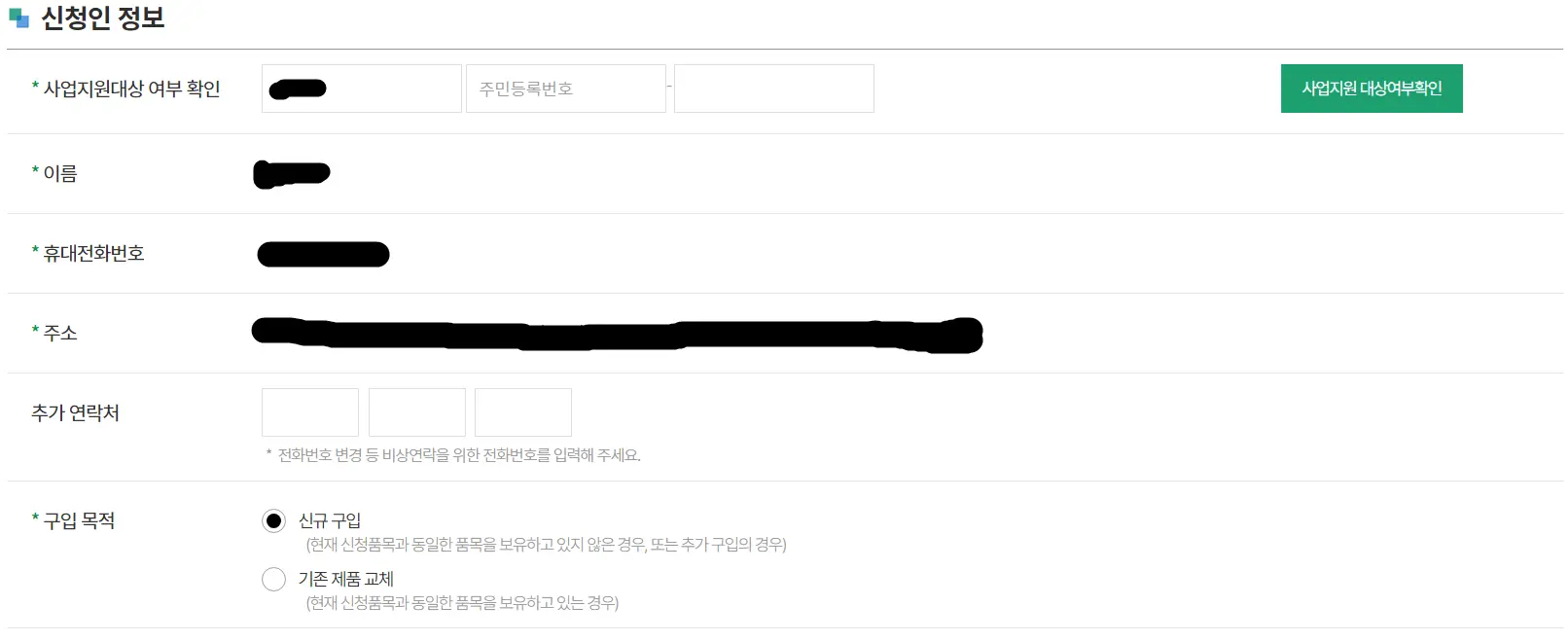 혹시나 세대원이 신청하는 경우 세대주 정보를 입력하는 것이 아닌 세대원 본인 자신의 이름을 넣고 ‘지원 대상자가 아닙니다.’라는 팝업이 떠서 사업을 신청하지 못하는 경우가 있는데, 반드시 세대주 정보를 입력해 주세요!